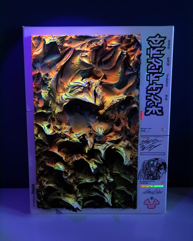 Each painting is a unique hand-made piece which includes special and hidden features (UV fluo paint & ink, liquid chrome elements, holographic tape, texture which changes depending on the light source/direction, and much more).
