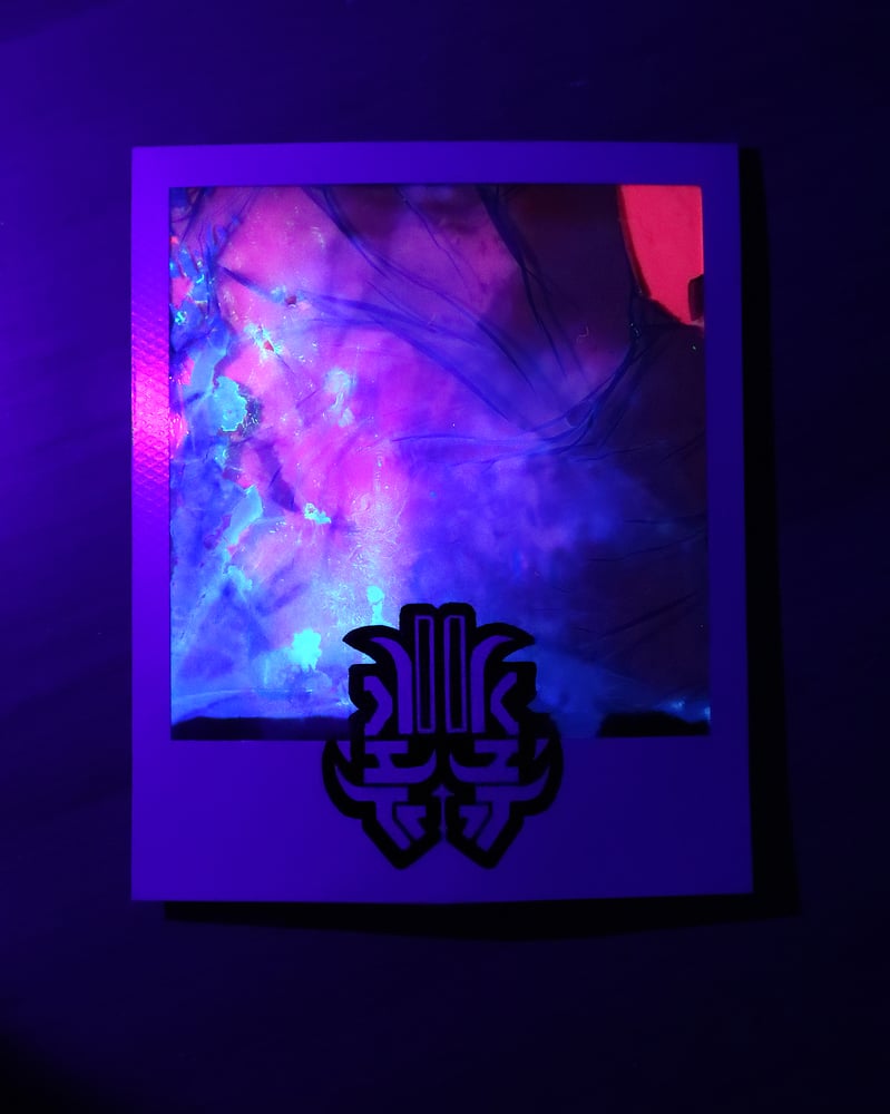 This Polaroïd contains IRIDESCENT foil, which reacts to light direction, and is also FLUORESCENT under a blue UltraViolet light (as visible on the last picture below).