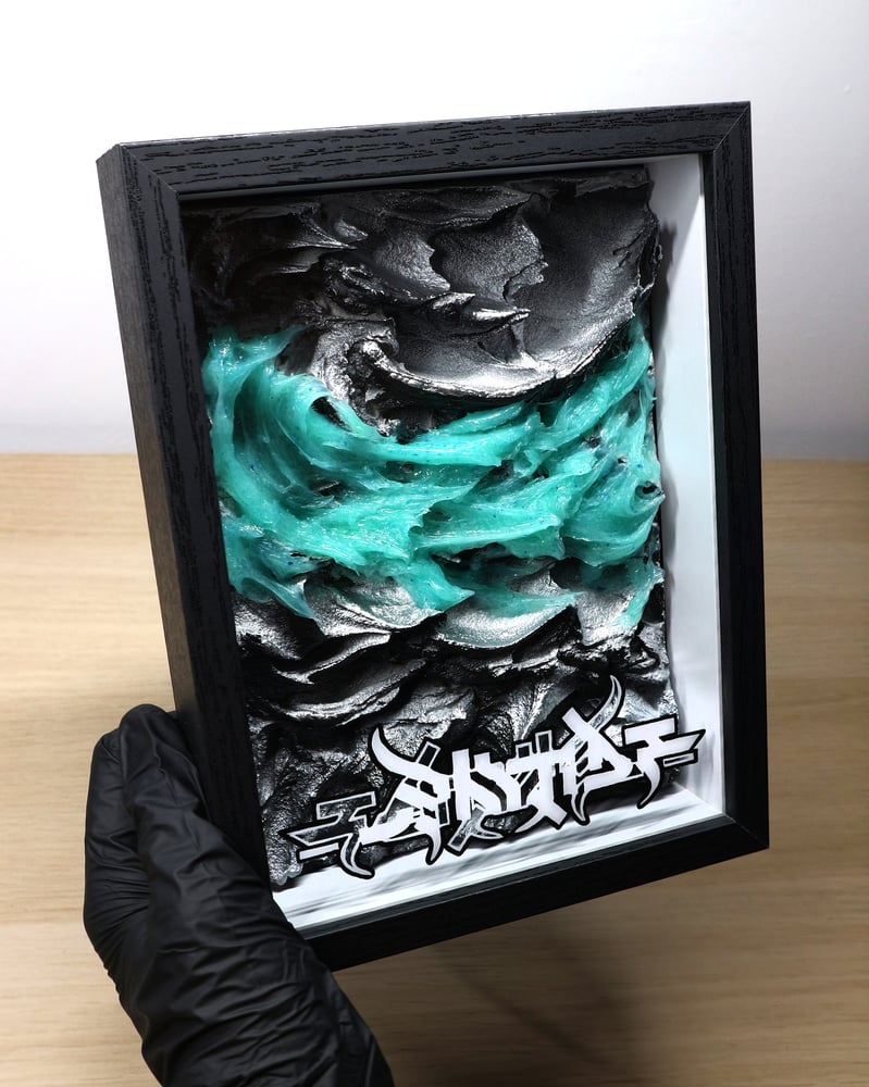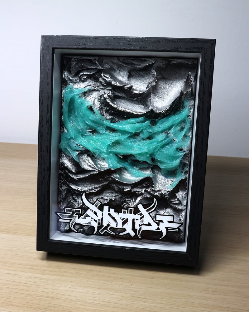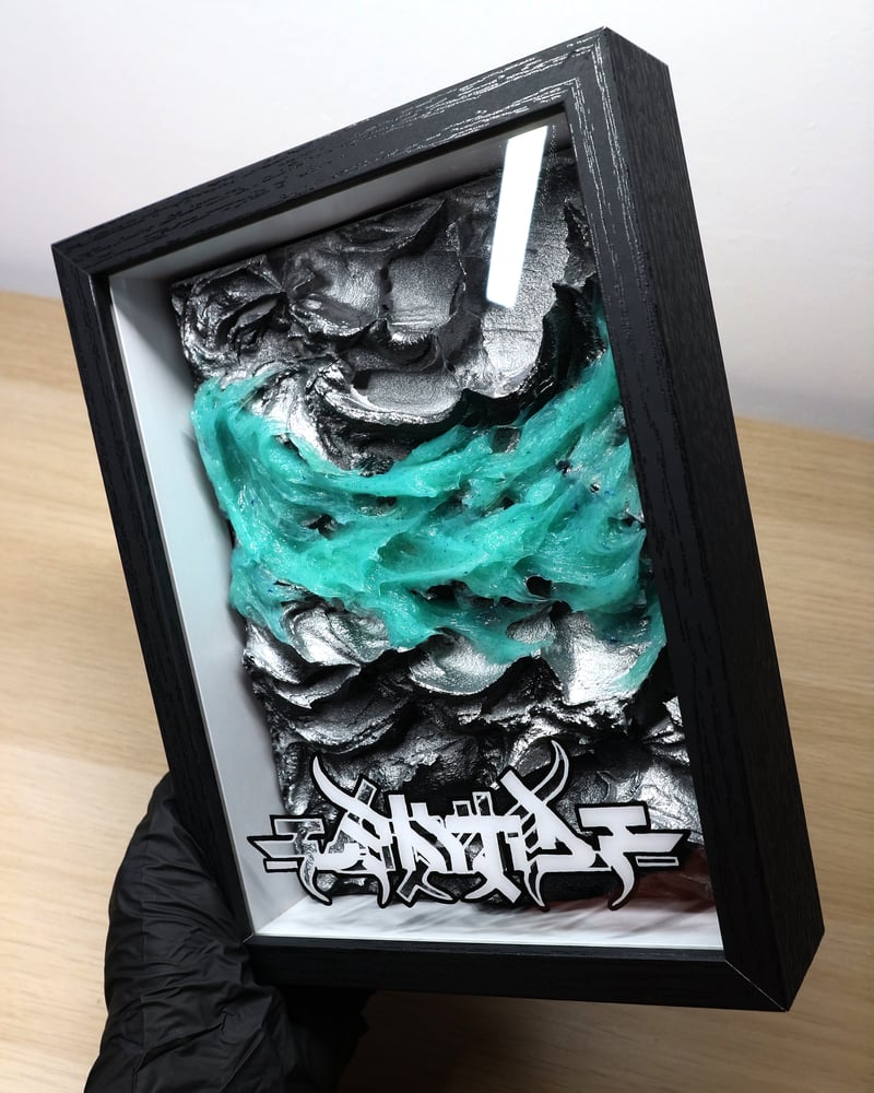 Acrylic paint, chrome ink, concrete plaster gel, fluorescent silicone on Acetate plexiglas 3D SHADOWBOX FRAME, 22 x 17 cm (9 x 7 inches).