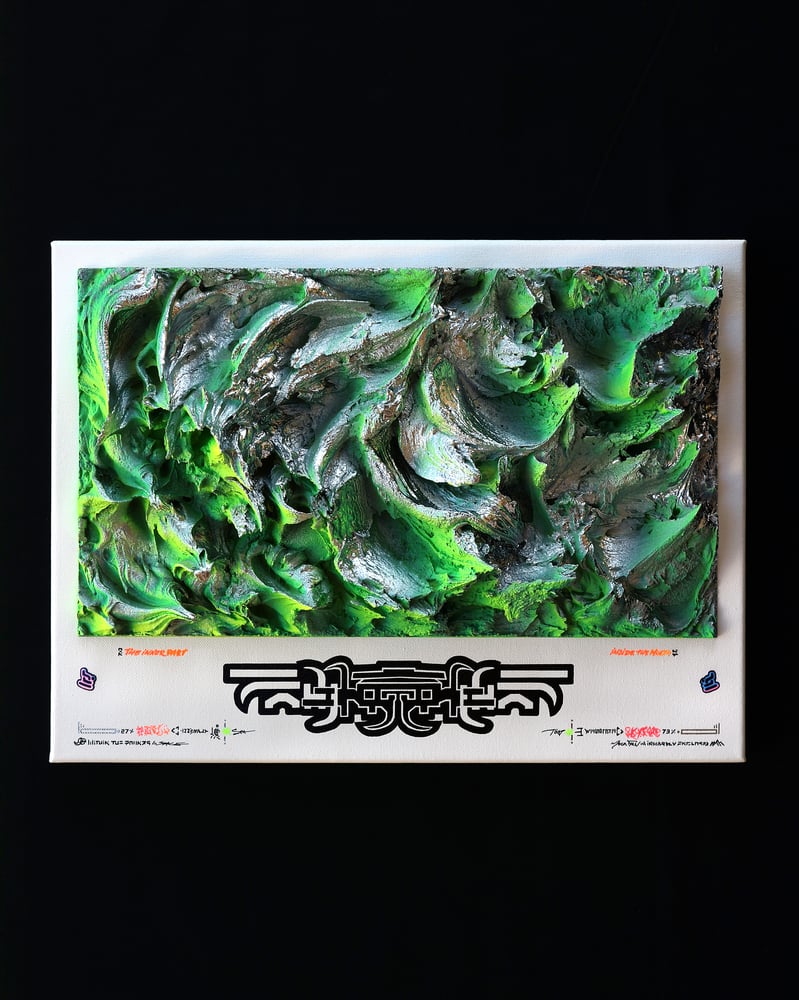 Each painting is a unique hand-made piece which includes special and hidden features (UV fluo green & orange lettering details, liquid chrome texture, iridescent tape, texture which changes depending on the light source/direction, and much more).